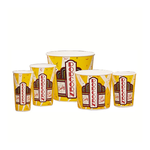 You will have no problem selling your freshly popped popcorn in these eye-catching designs. Our Popcorn Cups come in multiple designs featuring our Red and Blue Popcorn Cup, Premier Design Popcorn Cup, "Popcorn" Design Popcorn Cup and Showtime Popcorn Cup. These cups range in capacity from 24-oz. to 170-oz. for your popping needs. These Popcorn Cups are a staple to have in your popcorn supplies at movie theatres. (.8-oz. - Case Count: 1,000)
